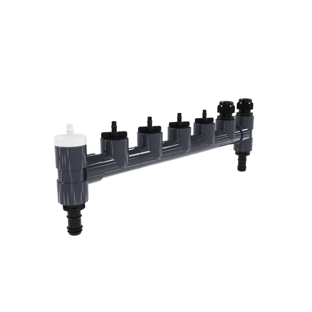 Имеет два герметичных соединения для электродов рН и ЕС и пять вводов, три из которых предназначены для добавления элементов питания, а два - для корректоров рН.